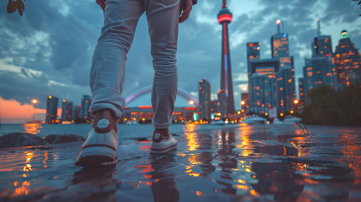 Elevate men's selvedge denim with accessories for a celebrity-inspired look. Summer season. French male. CN Tower, Toronto, Canada city background.