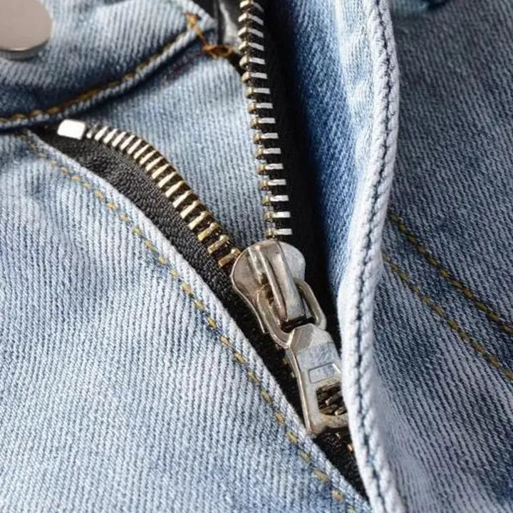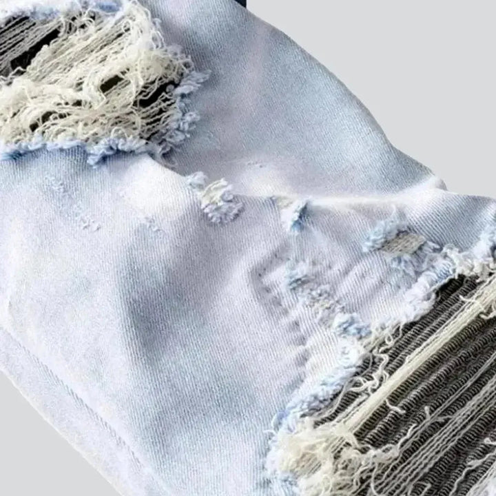 • Black-Patches: The bold black patches on these jeans add a touch of edge and contrast to the light-wash denim.