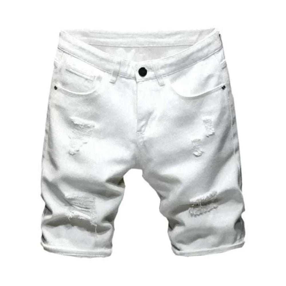 Make summer 2021 a season to remember with our 2023 Summer Collection white men's distressed denim shorts, a modern take on grunge style! Conjure up vintage vibes with the distressed design while the mid-waist fit, zipper & button closure, and skinny cut create an undeniably alluring look.